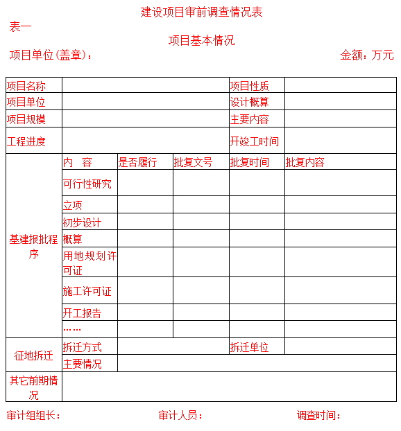 某集團(tuán)公司《基本建設(shè)項(xiàng)目跟蹤審計(jì)實(shí)施細(xì)則》中規(guī)定了審前調(diào)查的內(nèi)容,包括:基建項(xiàng)目報(bào)批情況、內(nèi)控制度建立和執(zhí)行情況、項(xiàng)目概算的批準(zhǔn)與調(diào)整情況、年度資金預(yù)算安排情況、建設(shè)資金籌措計(jì)劃與實(shí)際到位情況、基本建設(shè)程序執(zhí)行情況、其他情況;同時(shí)給出了審前調(diào)查模板。具體如下: