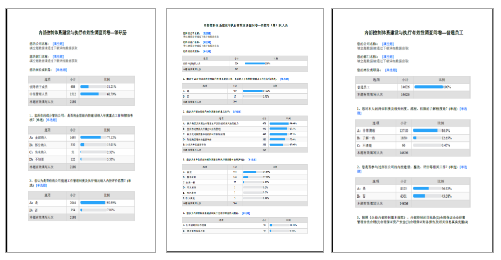 通過問卷調(diào)查成果的分析運用,有助于確定內(nèi)控建設(shè)和運行的方向及重點,促進內(nèi)控體系持續(xù)優(yōu)化;探究內(nèi)控評價的內(nèi)涵和外延,保障內(nèi)控評價持續(xù)有效;推動基層單位內(nèi)控管理工作常態(tài)化。