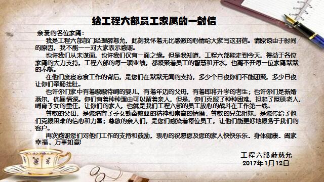 會(huì)議第二環(huán)節(jié)是慰問(wèn)家屬環(huán)節(jié)。工程六部取得的各項(xiàng)成績(jī)是各位員工的辛勤付出,更離不開(kāi)各位員工家屬對(duì)他們工作的支持,為了感謝他們的默默付出,今年的總結(jié)會(huì)議增加了慰問(wèn)家屬環(huán)節(jié),薛慈允部長(zhǎng)給員工家屬寫(xiě)了感謝信,感謝員工家屬的理解及支持。理素杰的家屬代表各位員工家屬發(fā)言,感謝公司給予員工的發(fā)展平臺(tái),家人永遠(yuǎn)是最堅(jiān)強(qiáng)的后盾。理素杰的女兒王若宇小朋友作畫(huà)表達(dá)了自己對(duì)工程六部全體人員的節(jié)日祝福。薛慈允部長(zhǎng)向員工家屬贈(zèng)與關(guān)懷禮物,祝愿各位員工家庭和睦、快樂(lè)幸福!