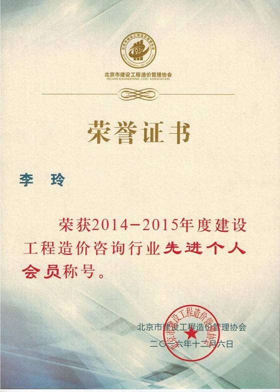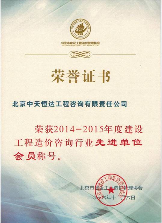 中天恒達(dá)工程咨詢公司在2014-2015年度工程咨詢行業(yè)評選中,承續(xù)榮耀,再次獲得北京市建筑工程造價管理先進(jìn)單位會員和先進(jìn)個人會員(李玲)榮譽。
