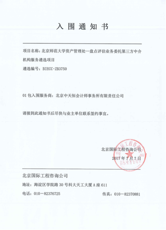 中天恒為北京師范大學提供了多年的內(nèi)部審計服務(wù),一直以來與北師大保持著良好的關(guān)系,此次參與北師大盤點評估業(yè)務(wù)招投標工作,我公司一如既往的認真參與、全情投入,呈現(xiàn)出中天恒一貫的優(yōu)秀品質(zhì)。細節(jié)決定成敗——對技術(shù)方案的細化、對報價的審慎、對現(xiàn)場陳述的演練,在在體現(xiàn)出中天恒人的敬業(yè)與專業(yè)。