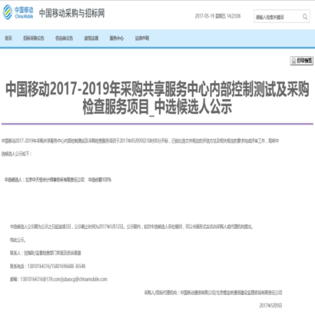 2017年5月12日我所憑借以往對(duì)中國移動(dòng)內(nèi)部控制測(cè)試及采購檢查服務(wù)的經(jīng)驗(yàn),成功中標(biāo)中國移動(dòng)2017-2019年采購共享服務(wù)中心內(nèi)部控制測(cè)試及采購檢查服務(wù)項(xiàng)目。