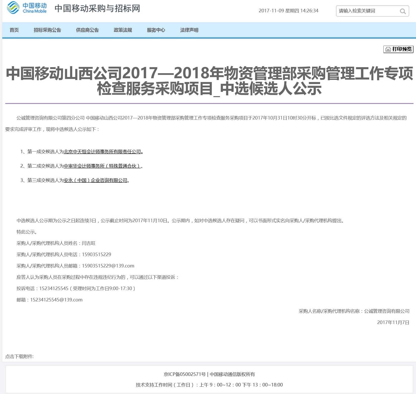20171030日我所參加了中國移動山西公司2017-2018年物資管理部采購管理工作專項(xiàng)檢查服務(wù)采購項(xiàng)目,經(jīng)過兩次的投標(biāo)工作,憑借完備的資質(zhì)條件,豐富的采購專項(xiàng)審計(jì)經(jīng)驗(yàn),最終以55.8萬元中標(biāo)。