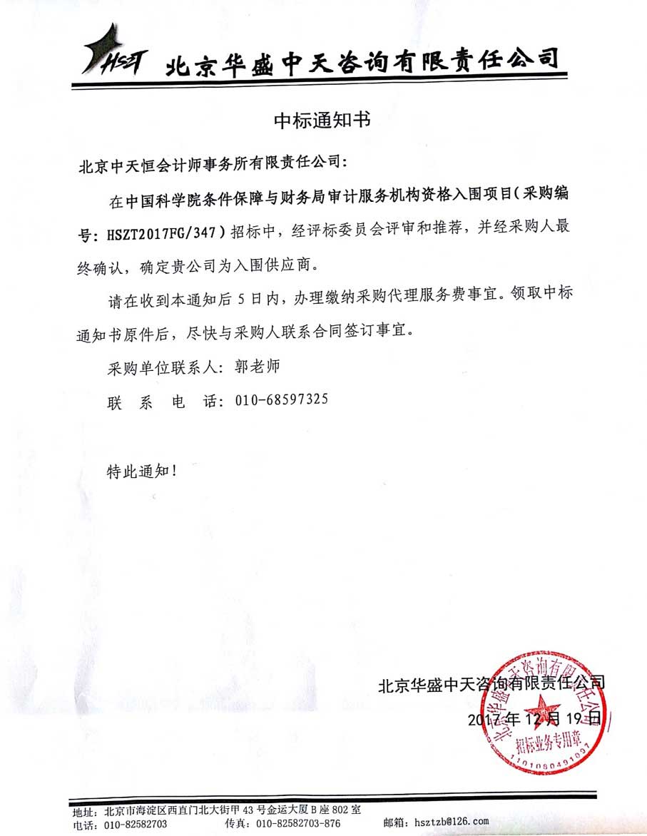 2017年12月13日我所參加了由北京華盛中天咨詢有限責(zé)任公司組織的中國科學(xué)院條件保障與財務(wù)審計服務(wù)機構(gòu)資格入圍項目的投標工作。此次招標內(nèi)容,主要為中科院科提供科技專項檢查、資產(chǎn)清查鑒定、內(nèi)部控制評價、盡職調(diào)查、產(chǎn)權(quán)登記以及日常財務(wù)監(jiān)督檢查等審計服務(wù),服務(wù)期限3年。我所在投標過程中,憑借其完備的資質(zhì)條件,通過對以往的審計服務(wù)經(jīng)驗,及合理的人員配備,在35家競爭單位中脫穎而出,成功入圍此項目。