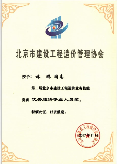 工程五部林琳,榮獲北京市建設工程造價管理協(xié)會舉辦的第二屆北京市建設工程造價“造價杯”業(yè)務技能競賽“優(yōu)秀造價專業(yè)人員獎”!