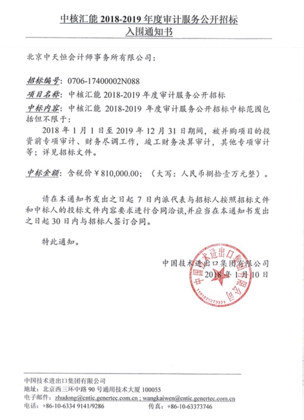 中核匯能2018-2019年度審計(jì)服務(wù)入圍喜報(bào)