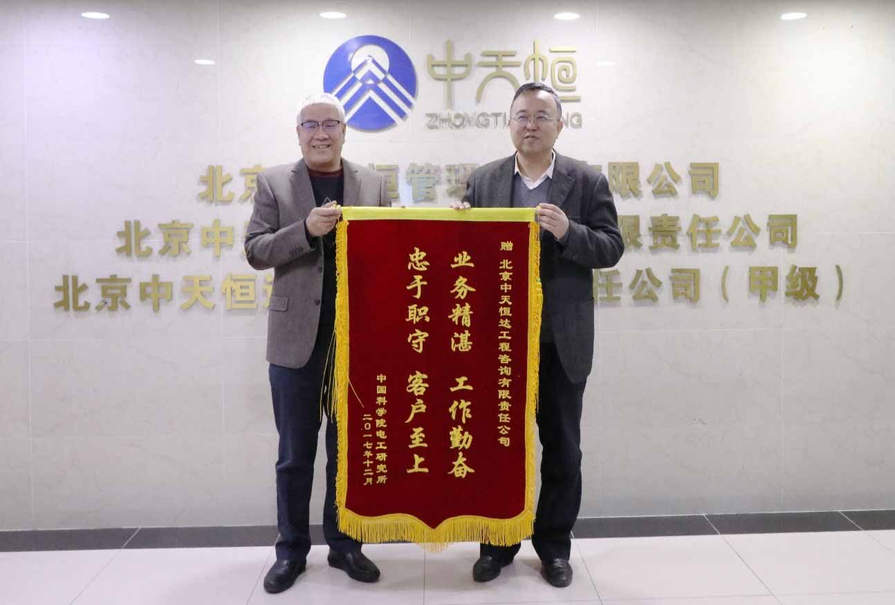 年末初春,我們中天恒迎來了尊貴的客人。2018年2月8日是一個喜慶的日子,上午10點30分,中國科學院電工研究所的宋所長、張主任和辦公室負責人夏爽一行,伴著嚴寒風塵仆仆的來到我們中天恒,宋所長代表中國科學院電工研究所,為我們中天恒獻上了一面鮮艷奪目意味深長的錦旗。
