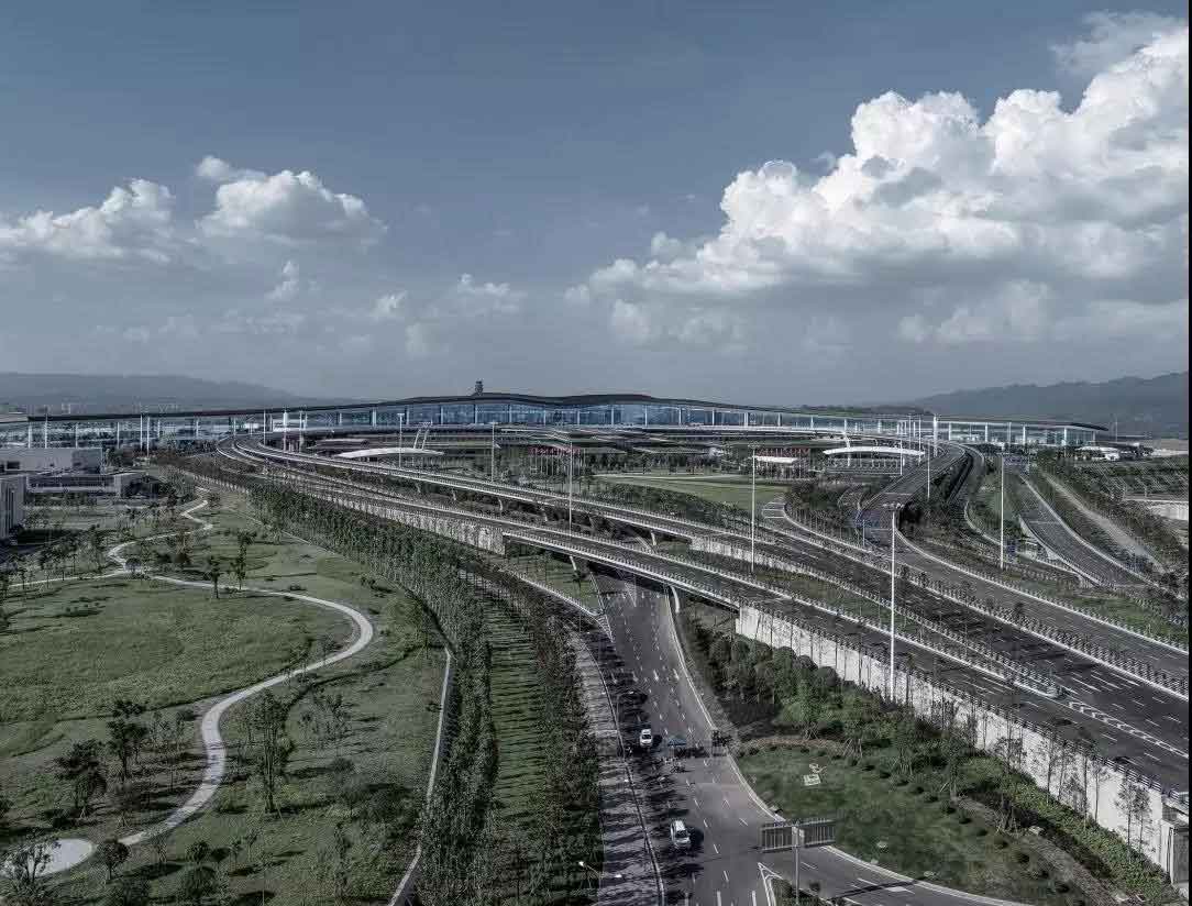 重慶江北機(jī)場航站樓以流線形平面向四周擴(kuò)散,平面布局簡潔均衡,并提供了機(jī)位充足、步行距離短、方向清晰、流程明了的空間布局。航站樓規(guī)模53.7萬平米,年吞吐量4500萬人次。