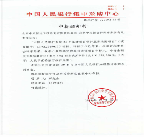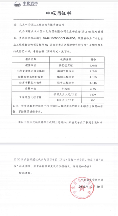 通過(guò)投標(biāo)中心和工程七部的共同努力,2019年12月16日中標(biāo)中國(guó)人民銀行系統(tǒng)24個(gè)基建項(xiàng)目審計(jì)采購(gòu)項(xiàng)目,2019年12月20日又喜中“中化集團(tuán)有限公司農(nóng)業(yè)事業(yè)部中化農(nóng)業(yè)工程造價(jià)咨詢項(xiàng)目標(biāo)段6:綜合類南方區(qū)域造價(jià)咨詢項(xiàng)目”,服務(wù)地區(qū)包括:上海市,重慶市,江蘇省,浙江省,安徽省,福建省,湖南省,廣東省,海南省,四川省,貴州省,云南省,廣西壯族自治區(qū),香港特別行政區(qū),澳門(mén)特別行政區(qū),江西省。