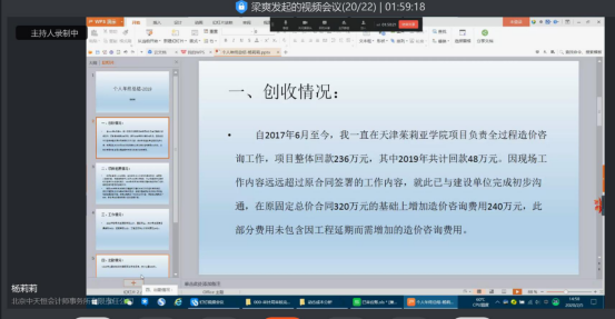 工程七部全體人員對2019年工作進行總結(jié),內(nèi)容包括出勤情況、完成項目情況、創(chuàng)收情況及2020年工作計劃,均用ppt進行了演示。大家認真的聽取了總結(jié),也互相了解到每位工程師的工作情況,部長對每位工程師進行了點評,對各位工程師做出的成績給予肯定,也表達了由衷的謝意。我們部門每個人都讓我感動,老大姐林國婷,那是我們學習的榜樣,不管在軌道交通項目上還是在博鰲亞洲論壇項目上,勤勤懇懇、勇于擔當,業(yè)主認可;楊莉莉和王源在天津濱海項目上已經(jīng)駐場兩年半了,楊莉莉駐場時女兒剛一生日多;楊栩在佛山項目駐場兩年了;李中英、梁爽在海南項目上駐場也將近兩年。他們沒有怨言,帶著對家人的思念,一直堅守自己的崗位,要堅持的項目竣工撤場;王姣、姜芳玉趕上元旦了還是應委托方要求出差去了四川;靳芳芳懷孕期間克服交通困難每天按時到協(xié)和項目上工作;姚濤、李美芹、王錦秀、楊善好、孟微、趙海、王涵瑩、胡立軍、程瀟等等哪里需要就到哪里。