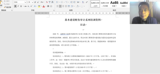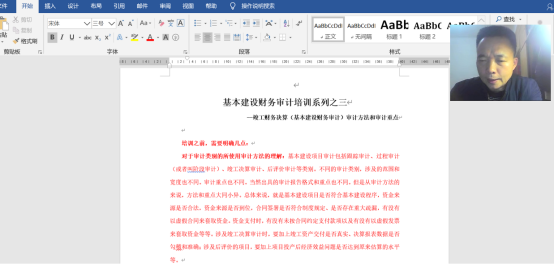 為進一步提升部門在基本建設(shè)審計方面的專業(yè)能力,財審六部分別在2019年2月11日與2月24日進行了部門基本建設(shè)財務(wù)審計培訓(xùn),培訓(xùn)采用釘釘遠程會議系統(tǒng),每次培訓(xùn)時長2-3小時,部門馬從定老師主講,財審六部全體員工參加,目的是通過培訓(xùn)使部門員工了解和熟悉基本建設(shè)財務(wù)審計業(yè)務(wù)。