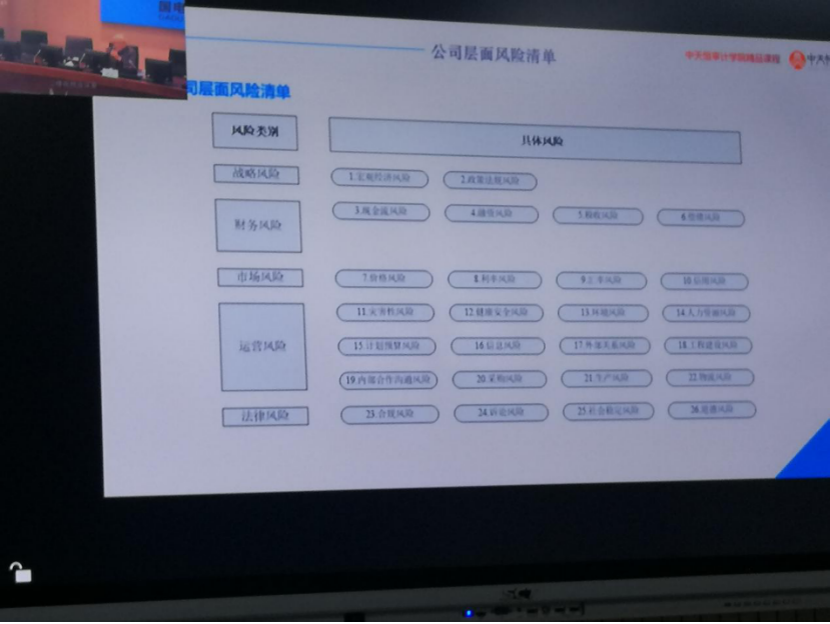 此次李總在成都的風(fēng)險(xiǎn)管控講座,受到了國(guó)能集團(tuán)大渡河公司高度重視,大渡河公司要求大渡河流域的二級(jí)單位相關(guān)人員同步開(kāi)展視頻聽(tīng)課,各項(xiàng)目公司也非常重視與珍惜此次培訓(xùn)與講座課程,公司分管領(lǐng)導(dǎo)以及財(cái)務(wù)部、辦公室等相關(guān)人員都參加了視頻講座,李總針對(duì)風(fēng)險(xiǎn)管控自行制作的風(fēng)險(xiǎn)示意圖博得分會(huì)場(chǎng)上陣陣掌聲,李總還例舉了大量的實(shí)際案例,以風(fēng)險(xiǎn)為審計(jì)“焦點(diǎn)”,開(kāi)拓風(fēng)險(xiǎn)管理領(lǐng)域,使與會(huì)人員受益匪淺。