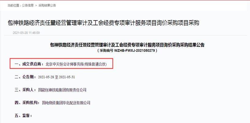 2021年5月28日,繼內蒙古平莊煤業(yè)(集團)有限責任公司領導人員經(jīng)濟責任審計等3項審計服務項目、國家能源集團江蘇電力有限公司領導人員經(jīng)濟責任審計等2項審計服務項目中標之后。能源集團包神鐵路又傳來好消息,我公司在包神鐵路集團經(jīng)責審計中再次中標。