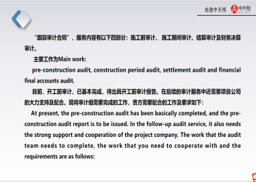 中天恒達審計單位負責人王慎云,審計工程師楊柳介紹了全過程跟蹤審計需求?!案檶徲嫼贤?,服務(wù)內(nèi)容有以下四部分:施工前審計、 施工期間審計、結(jié)算審計及財務(wù)決算審計。