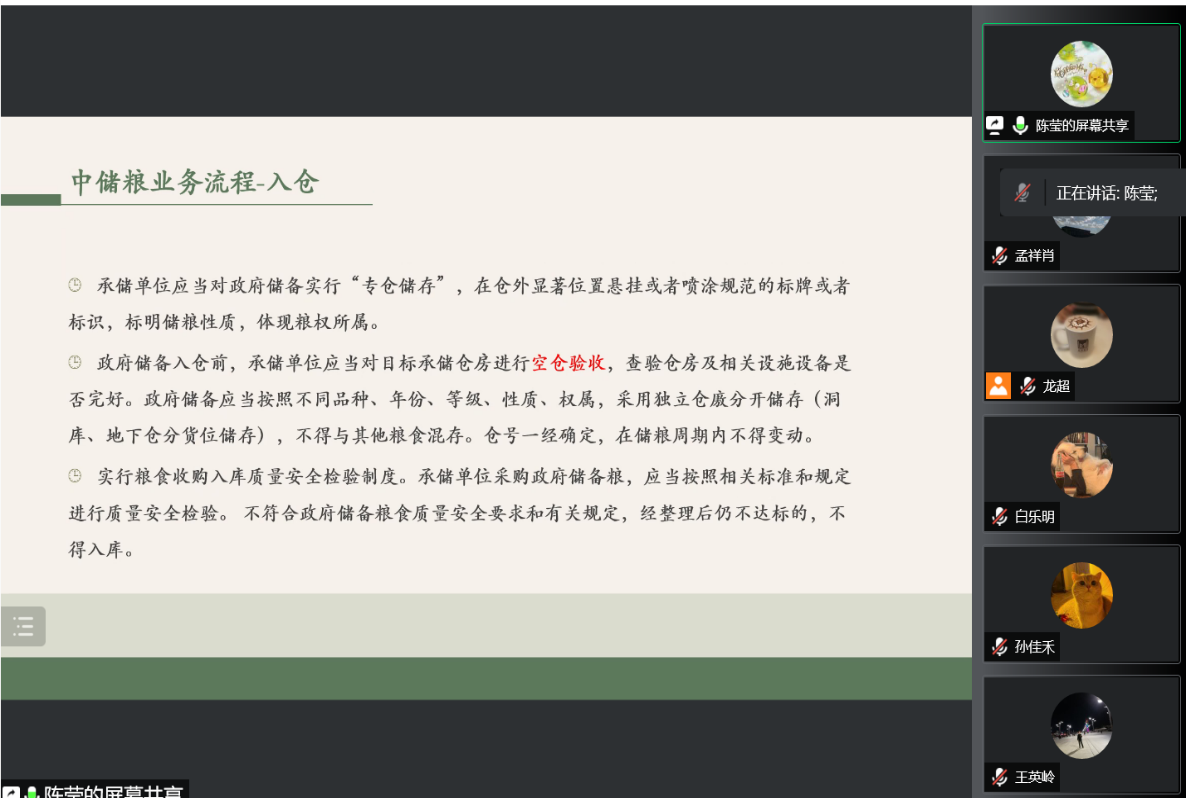 5月4日晚7:30《中儲糧基礎(chǔ)知識培訓(xùn)》視頻培訓(xùn),由高級項目經(jīng)理陳瑩老師主講,陳瑩老師通過對“中儲糧公司簡介”、“中儲糧主要業(yè)務(wù)簡介”、“中儲糧基礎(chǔ)知識介紹”等三方面進(jìn)行了培訓(xùn),近一個小時的培訓(xùn)結(jié)束了,培訓(xùn)內(nèi)容著實的精彩,我相信對于沒接觸過中儲糧業(yè)務(wù)及剛?cè)肼殘龅娜藛T來說,此次培訓(xùn)內(nèi)容非常的重要。聽完之后,使我對中儲糧業(yè)務(wù)又有了更深的理解,有點意猶未盡……