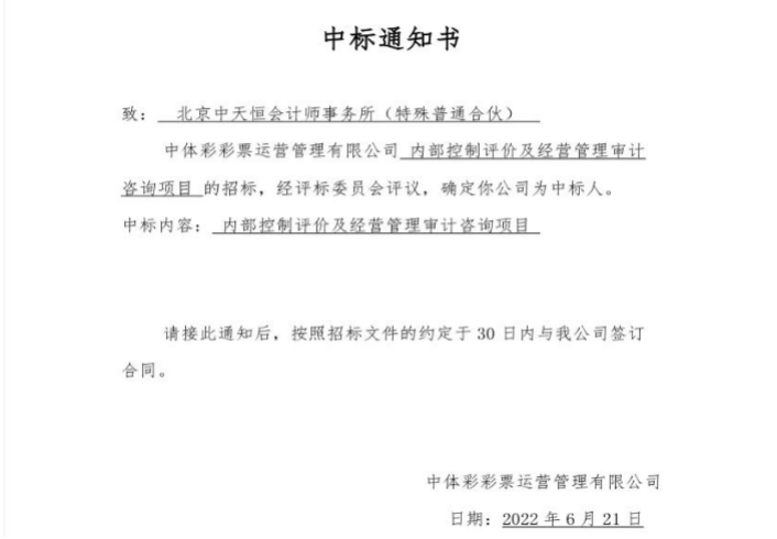 2022年6月6日,中體彩彩票運(yùn)營管理有限公司發(fā)出《中體彩彩票運(yùn)營管理有限公司內(nèi)部控制評價及經(jīng)營管理審計咨詢項(xiàng)目采用競爭性談判方式比選供應(yīng)商邀請函》。