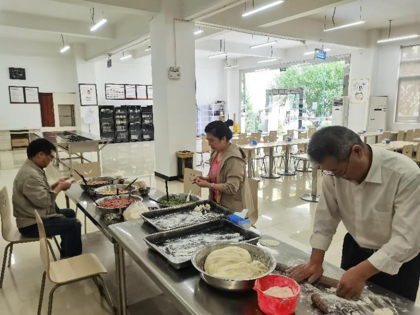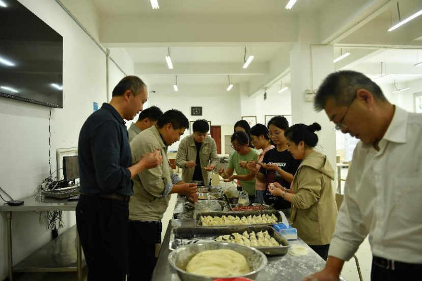 跟蹤審計申學(xué)靜(中)與猴子巖公司總經(jīng)理(左)、副總經(jīng)理(右)中秋節(jié)在食堂包餃子慶中秋