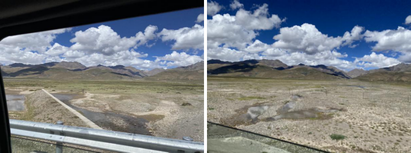 路上經(jīng)歷了夜間的寒冷,也被白天的陽(yáng)光所沐??;根據(jù)導(dǎo)航指出的方向和路線(xiàn),在海拔5000米的那曲地區(qū),天邊隨處可見(jiàn)的高山,還有那一片一片帶來(lái)陣陣急雨的烏云,置身其中就感覺(jué)此刻我們?cè)诖蟮啬赣H的心臟里,隨著道路的起伏,顛簸不斷的汽車(chē)也好像跟隨我們一起在感受大地的心跳!打開(kāi)車(chē)窗迎面撲來(lái)的大風(fēng)很急,頗有種“好風(fēng)憑借力,送我上青云”的感覺(jué)!