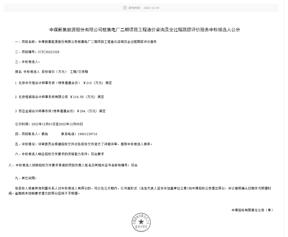 2022年12月1日,北京中天恒達工程咨詢有限責(zé)任公司和北京中天恒會計師事務(wù)所(特殊普通合伙)組成聯(lián)合體在“中煤新集能源股份有限公司板集電廠二期項目工程造價咨詢及全過程跟蹤評價服務(wù)”項目競標(biāo)中,憑借過硬的技術(shù)方案,扎實高效的工作作風(fēng)、卓越的運作團隊和良好的企業(yè)信譽,以絕對優(yōu)勢中標(biāo)。本次中標(biāo)歷經(jīng)坎坷,來之不易,在此特向廣大公司同仁報導(dǎo)喜訊。