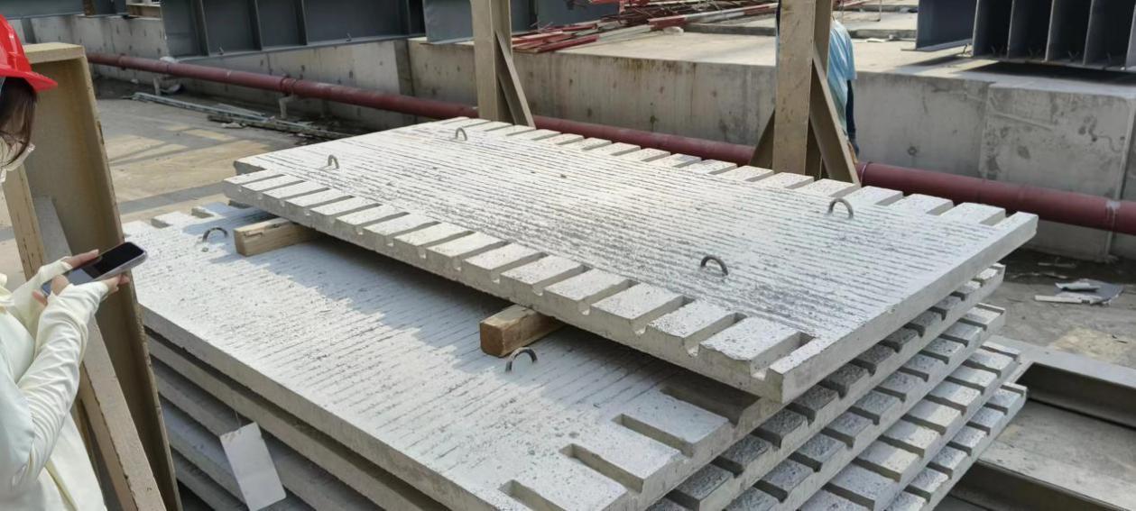 首先是6001、6003地塊宿舍樓采用不出筋開槽混凝土疊合板樓板施工工藝,該項施工技術(shù)是清華大學院士研發(fā)的專利技術(shù)。其優(yōu)勢是與傳統(tǒng)疊合板相比,不出筋混凝土疊合板樓板取消外伸鋼筋(胡子筋),安裝效率提升一倍;取消桁架鋼筋,鋼筋用量降低20%-30%;預支板厚度增加15%-30%;采用密拼式連接,不預留濕接縫,工序簡化。經(jīng)多項測試,槽口錨固21d,鋼筋可屈服,等同現(xiàn)澆受力。