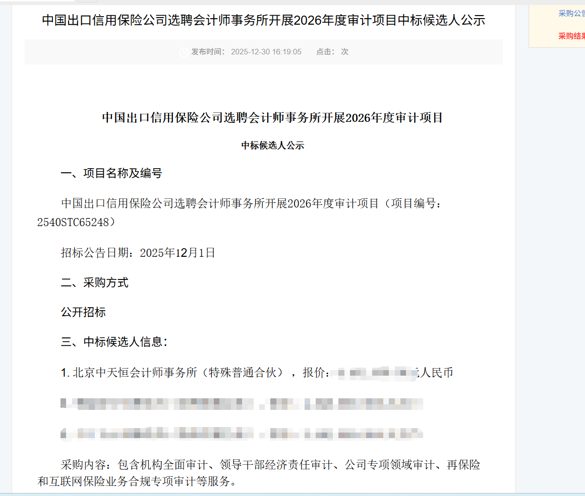 2026年1月8日,北京中天恒會計師事務所(特殊普通合伙)《中國出口信用保險公司選聘會計師事務所開展2026年度審計項目》喜獲中標。