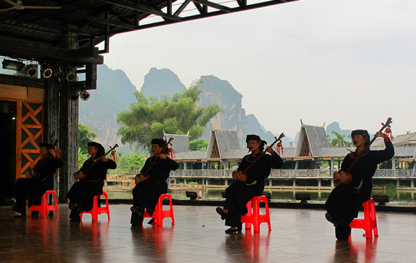 在景區(qū)里漫步,還能欣賞到當(dāng)?shù)卮迕竦谋旧硌?。歌舞彈唱,招招式式,都體現(xiàn)出壯族人民的熱情。舞臺(tái)下的坐席上,游客稀少,可是一點(diǎn)也不影響他們專注的表演。聽說,即使是臺(tái)下空無一人,他們?nèi)匀粫?huì)照常演出。