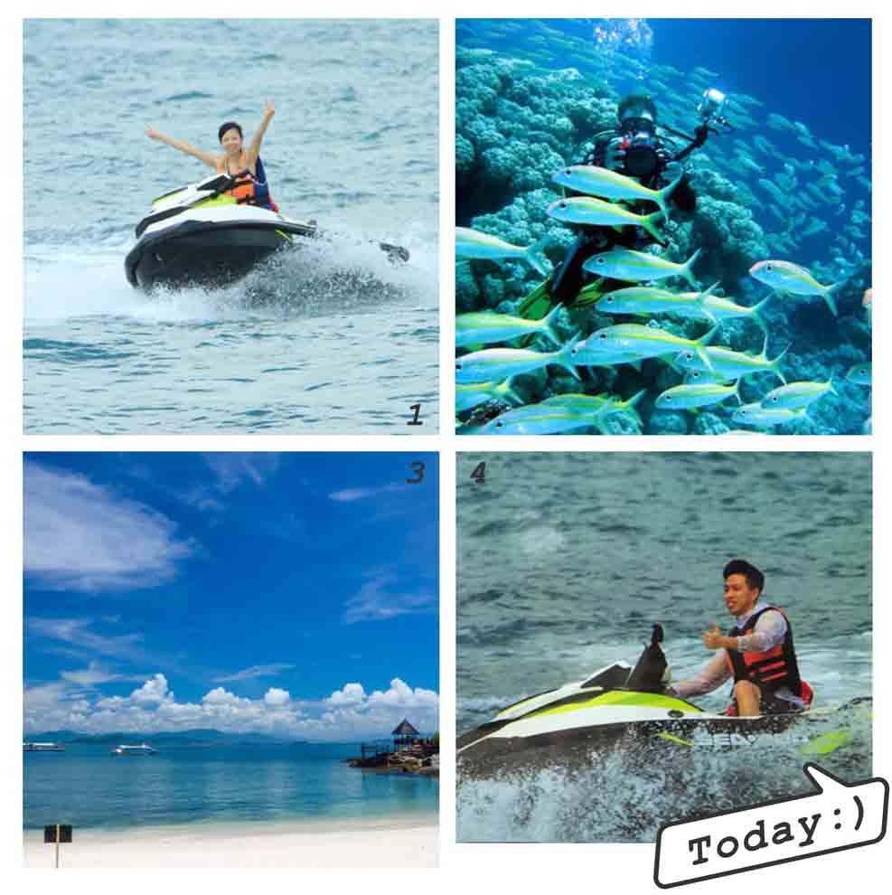 摩托艇教練教我們360度急速漂移,順帶品嘗了蜈支洲的海水是真的咸,潛水看到了各種奇形怪狀的珊瑚,還可以體驗捕魚的樂趣,水上活動我們玩的不亦樂乎,玩累了躺在沙灘上看看藍(lán)天也是一種美的享受,藍(lán)天、白云,沙灘、融為一體,用“秋水共長天一色”來形容再貼切不過了。