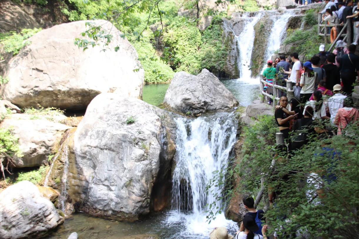 第二天上午,根據(jù)先前旅行計(jì)劃,我們直奔潭瀑峽。潭瀑峽地處云臺(tái)山北部略偏西,溝長(zhǎng)2000米,南北走向。溝東面,峭壁聳翠,溝西面,競(jìng)秀峰參差俏麗,峰群一字排列,爭(zhēng)奇斗異。溪水順流而下,在曲曲彎彎的溝槽內(nèi),聲音瀠洄耳旁,悅耳動(dòng)聽(tīng)。溪床,寬窄不同、曲折有致、形態(tài)各異。