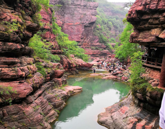 下午,我們?nèi)ネ婆_(tái)山最負(fù)盛名的景點(diǎn)-紅石峽。紅石峽為14億年前震旦紀(jì)地殼運(yùn)動(dòng)所造成的地質(zhì)遺跡,是云臺(tái)山景點(diǎn)的精華。游覽紅石峽的路線全線都是單行道,沿著一條彎曲的階梯路,一步一步地下到86米深的谷底,才能欣賞到深藏的奇景。棧道窄處,只容得兩人行走,順著棧道進(jìn)入紅色巖石陡立的峽谷半腰位置,發(fā)現(xiàn)兩側(cè)巖石觸手可及,兩岸峭壁山石秀麗,仿佛鬼斧神工雕鑿而成,明代懷慶知府徐以貞曾寫詩(shī)夸道:何年鬼斧劈層崖,鳥翼飛來(lái)一線開(kāi)。