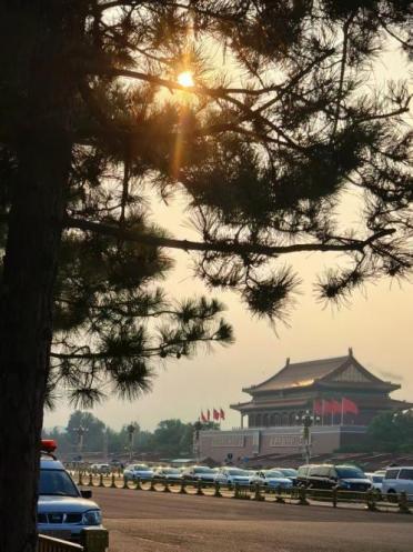 也曾在忙完審計工作后走進天安門廣場,夕陽透過松枝灑下金輝,給莊嚴的城樓鍍上溫暖光暈。城樓前紅旗獵獵,“中華人民共和國萬歲”“世界人民大團結(jié)萬歲” 的標語格外醒目,路上車輛有序往來,遠處草木郁郁蔥蔥。這一刻,所有忙碌都被這肅穆又溫柔的景象撫平,心中滿是對祖國的自豪,也格外珍惜這片刻寧靜。