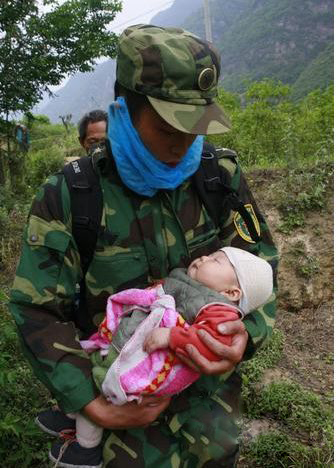 經(jīng)過(guò)一番努力,人們小心地把擋著她的廢墟清理開(kāi),在她的身體下面躺著她的孩子,包在一個(gè)紅色帶黃花的小被子里,大概有3、4個(gè)月大,因?yàn)槟赣H身體庇護(hù)著,他毫發(fā)未傷,抱出來(lái)的時(shí)候,他還安靜地睡著,他熟睡的臉讓所有在場(chǎng)的人感到很溫暖。